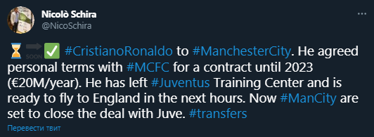 Роналду переходит в Манчестер Сити. Скриншот твиттера журналиста