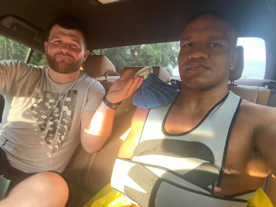 "Сюда входили реабилитационные процедуры на самой базе ( магниты / лазеры) дважды в день. Уколы, снимающие воспаление и обезболивающие. Отдельно работа с Владимировичем - комплекс упражнений для разработки и сохранение мышечного тонуса плеча - тоже дважды в день. У него у самого были подобные проблемы с плечом, он в курсе как это делается. Отдельно тренировки для поддержания общей формы! Делал все что мог, учитывая новые вводные - все упиралось лишь в ограниченное время до начала старта! Решили так - первая неделя в бандаже, не сильно нагружаем руку, чтобы чуть спало воспаление. Вторая неделя уже без бандажа закачиваем и восстанавливаем, наблюдая за состоянием и непосредственно в Токио выходим на ковёр для спаррингов, там у нас как раз есть 7 дней до старта.