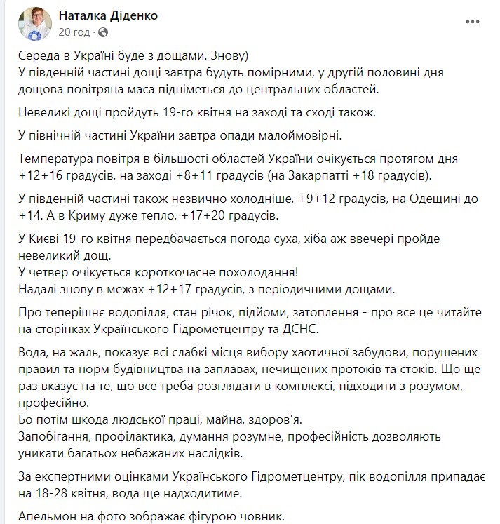 У середу, 19 квітня, в Україні пройдуть дощі. Зокрема, опади очікуються у південних регіонах, а в другій половині дня вони дійдуть до центральних областей. Похолодання слід очікувати вже із завтрашнього дня, 20 квітня.