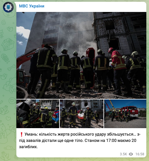 Число загиблих в Умані Черкаської області внаслідок сьогоднішнього ракетного удару зросло до 20 осіб. Ще 18 поранено, 9 з них перебувають у лікарні.