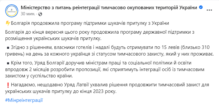 Про це повідомляє Міністерство реінтеграції.