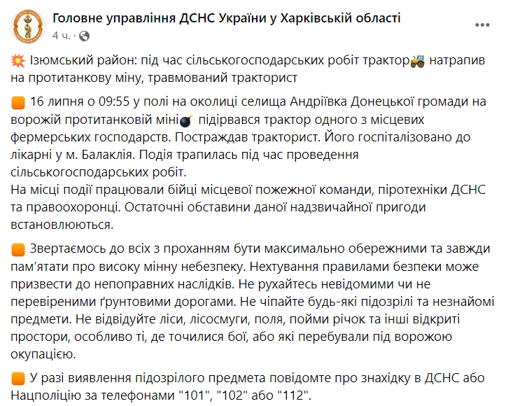 "16 липня о 09:55 у полі на околиці селища Андріївка Донецької громади на ворожій протитанковій міні підірвався трактор одного з місцевих фермерських господарств. Постраждав тракторист. Його госпіталізовано до лікарні у м. Балаклія", - йдеться у повідомленні.