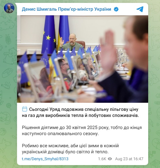 "Сьогодні уряд продовжив спеціальну пільгову ціну на газ для виробників тепла та побутових споживачів. Рішення діятиме до 30 квітня 2025 року, тобто до кінця наступного опалювального сезону", - йдеться у публікації.