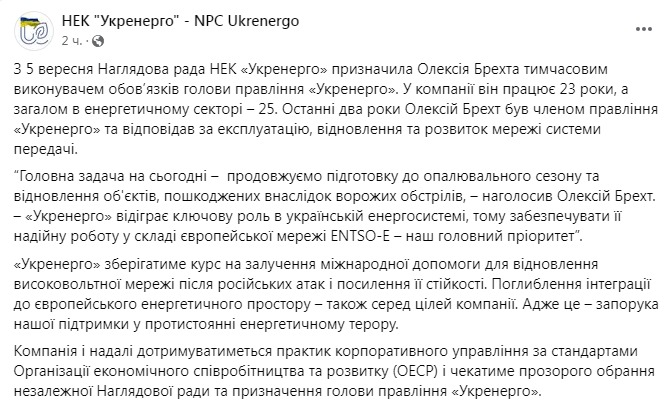 "З 5 вересня Наглядова рада НЕК "Укренерго" призначила Олексія Брехта виконувачем обов'язків голови правління "Укренерго". У компанії він працює 23 роки, загалом в енергетичному секторі – 25. Останні два роки Олексій Брехт був членом правління "Укренерго" та відповідав за експлуатацію, відновлення та розвиток мережі системи передачі", - сказано у публікації.