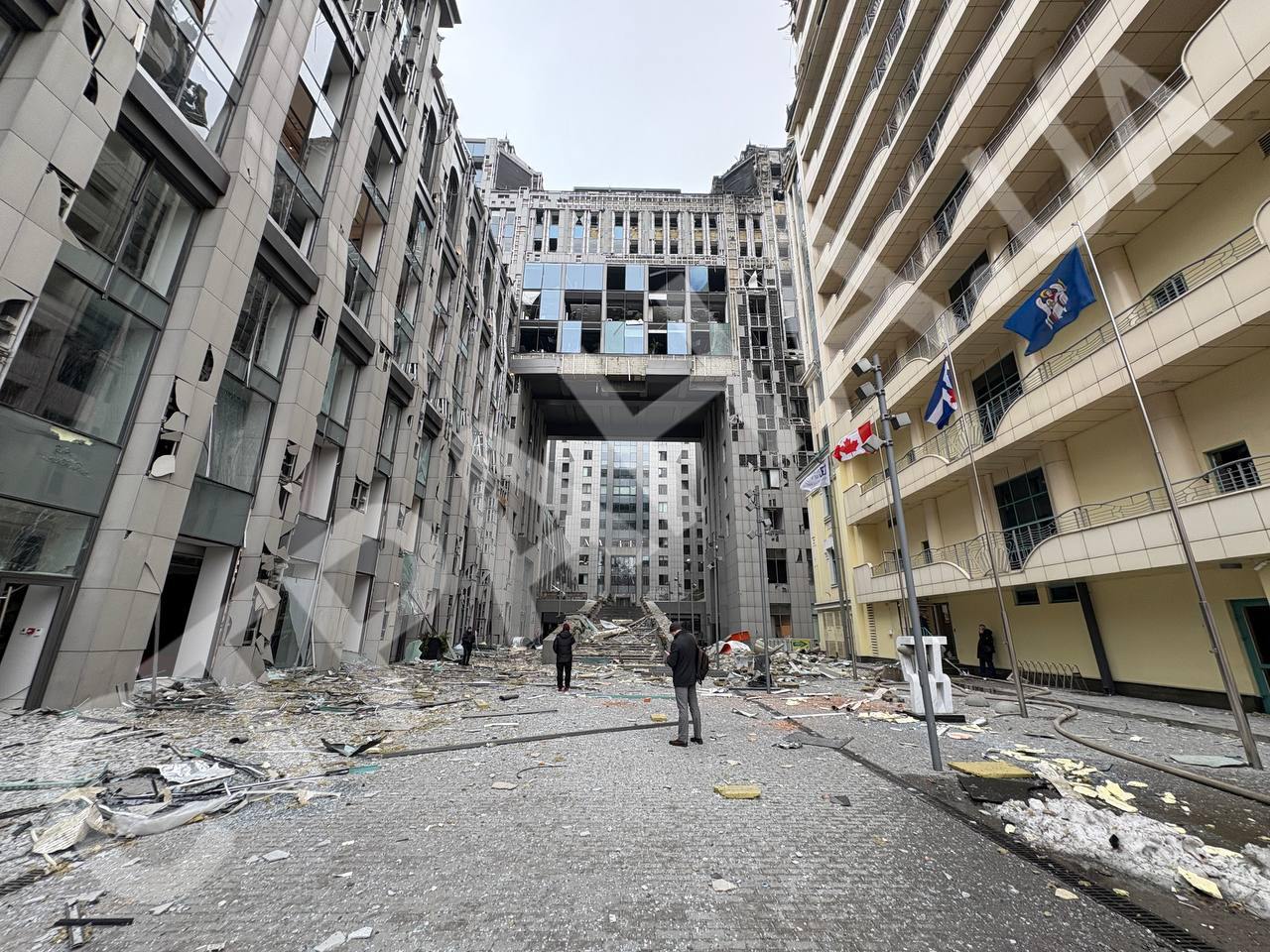 10:06 Наслідки ракетної атаки в готелі Holiday Kyiv, розташованому в БЦ "Торонто".