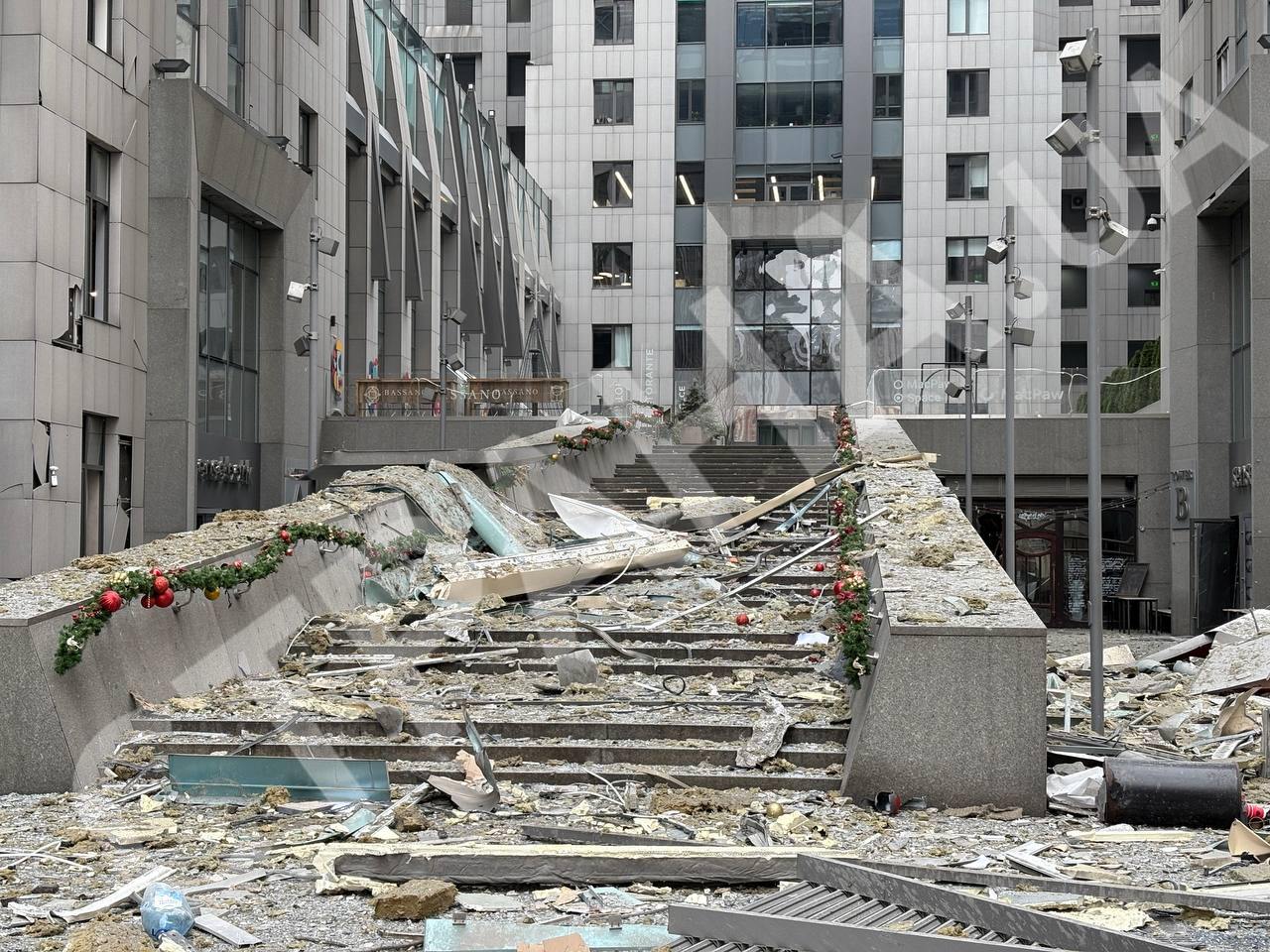 Частково зруйновано фасад бізнес-центру біля метро. Сама станція не постраждала.