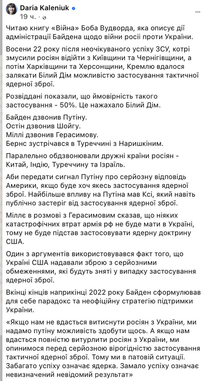 "У розмові чиновник Білого дому переконував мене, що все було не так. Він стверджував, що тоді у них дійсно були дані про можливий ядерний удар, але вони ніколи не обмежували допомогу через страх, що Україна здобуде надто швидку перемогу. Як повідомлялося, вони "орієнтувалися на думку власних розвідників про те, яка зброя потрібна Києву, а не на те, що просив безпосередньо Київ", - написала. вона.