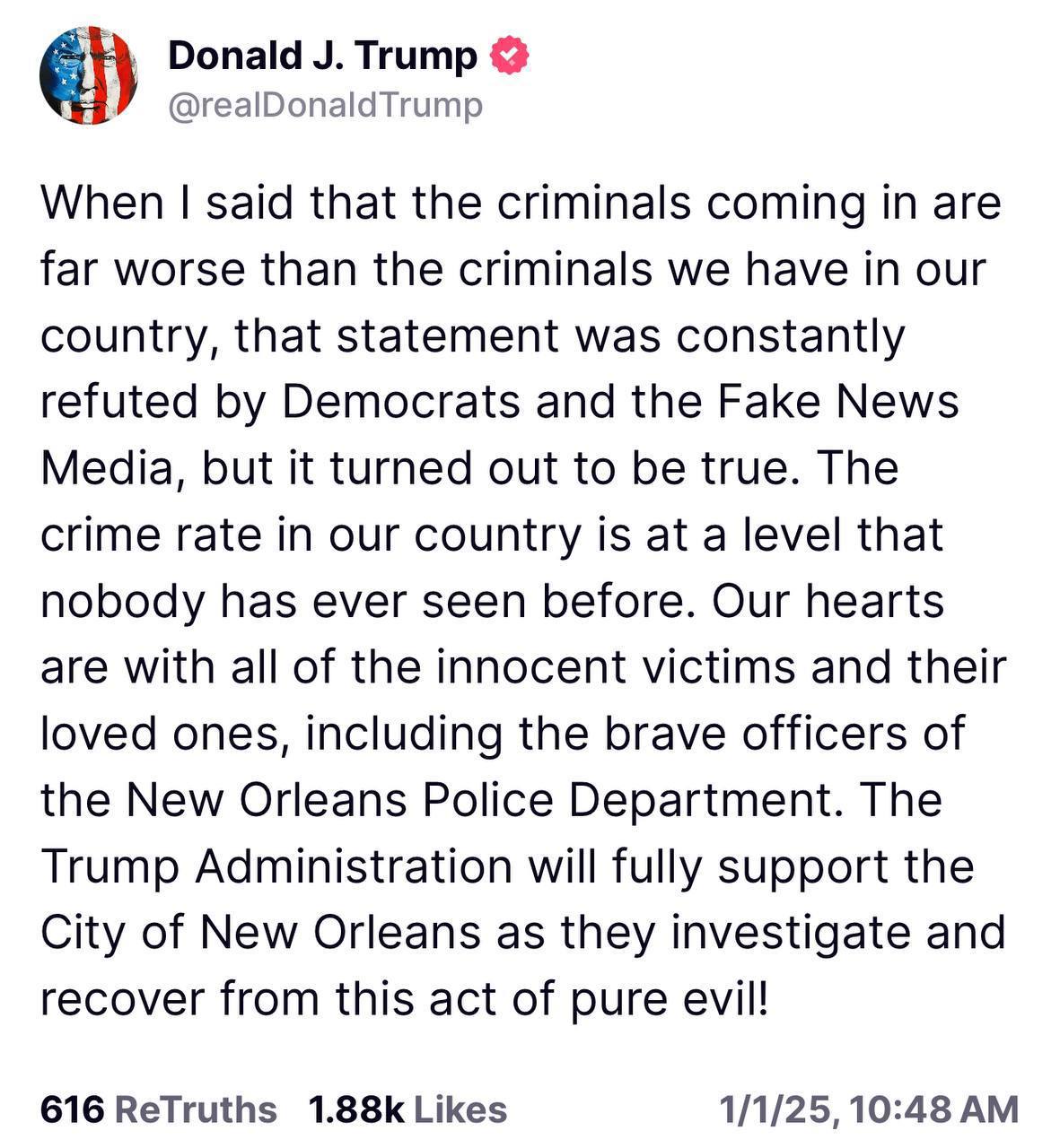 "Коли я сказав, що злочинці, які прибувають ззовні, набагато небезпечніші, ніж злочинці в нашій країні, демократи та фейкові ЗМІ постійно спростовували це твердження, але воно виявилося правдою. Злочинність у нашій країні досягла безпрецедентного рівня", – заявив майбутній президент.