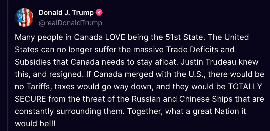 "Багато людей у Канаді подобається ідея бути 51-м штатом. Сполучені Штати більше не можуть терпіти величезні торгові дефіцити та субсидії, які необхідні Канаді для виживання. Джастін Трюдо це розумів і пішов у відставку. Якби Канада об'єдналася зі США, не було б тарифів, податки значно знизилися б, а сама країна була б повністю захищена від загроз із боку Російських та китайських кораблів, які постійно її оточують. Разом це була б чудова нація”, – написав обраний президент США.