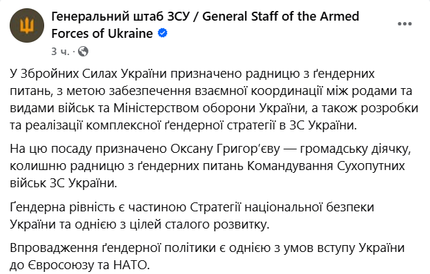 У Збройних силах України призначили нову радницю з ґендерних питань. На таку посаду призначено активістку Оксану Григор'єву.