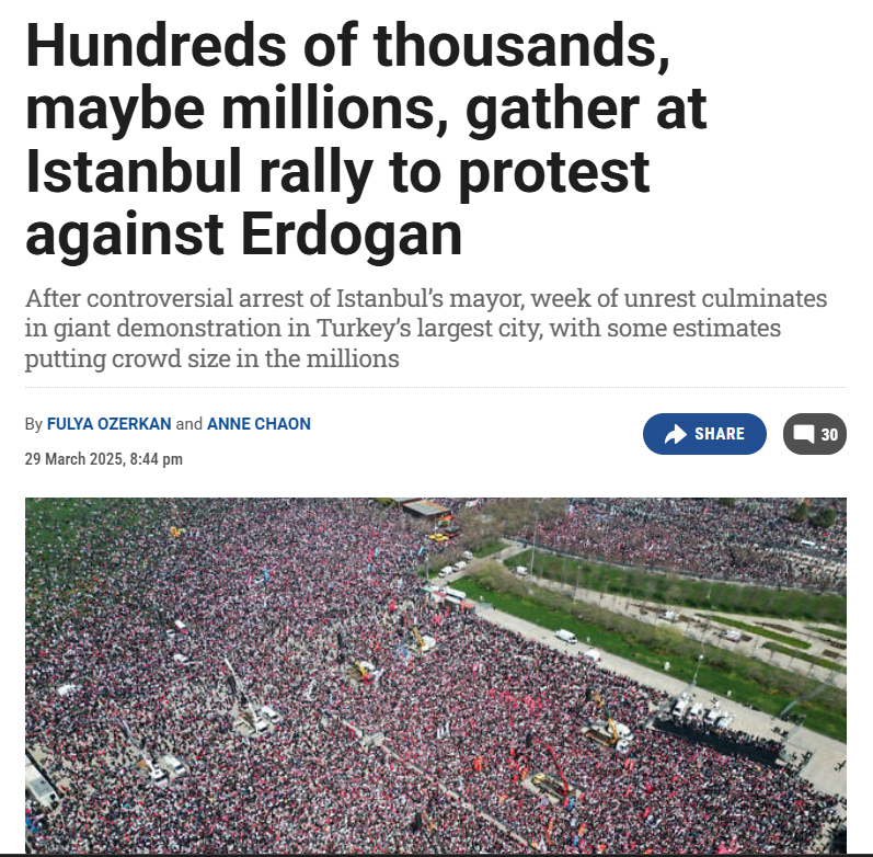 Вчорашня акція на підтримку арештованого мера Стамбула Екрема Імамоглу стала найчисленнішою з початку протестів.
