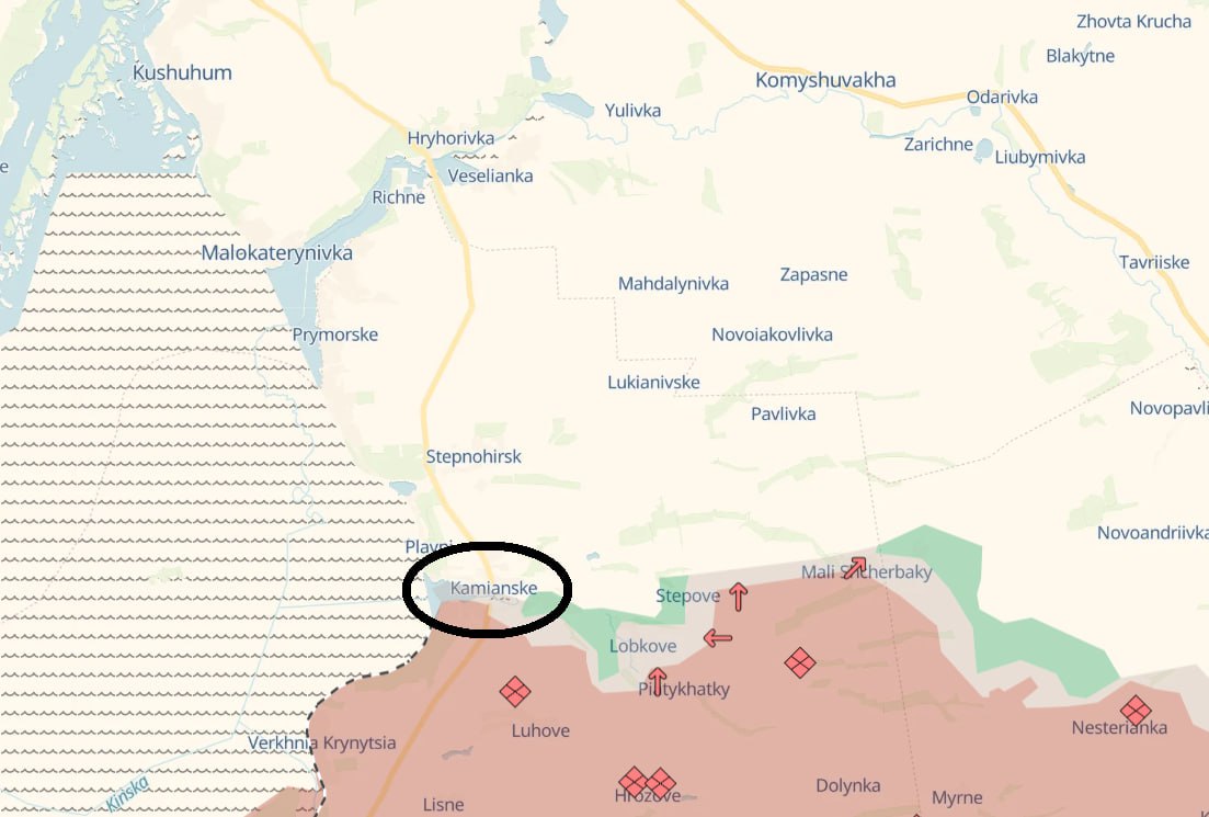 Російська армія здобула просування в районі селища Кам'янського Запорізької області та в селі Дніпроенергії південний захід Донецької області.