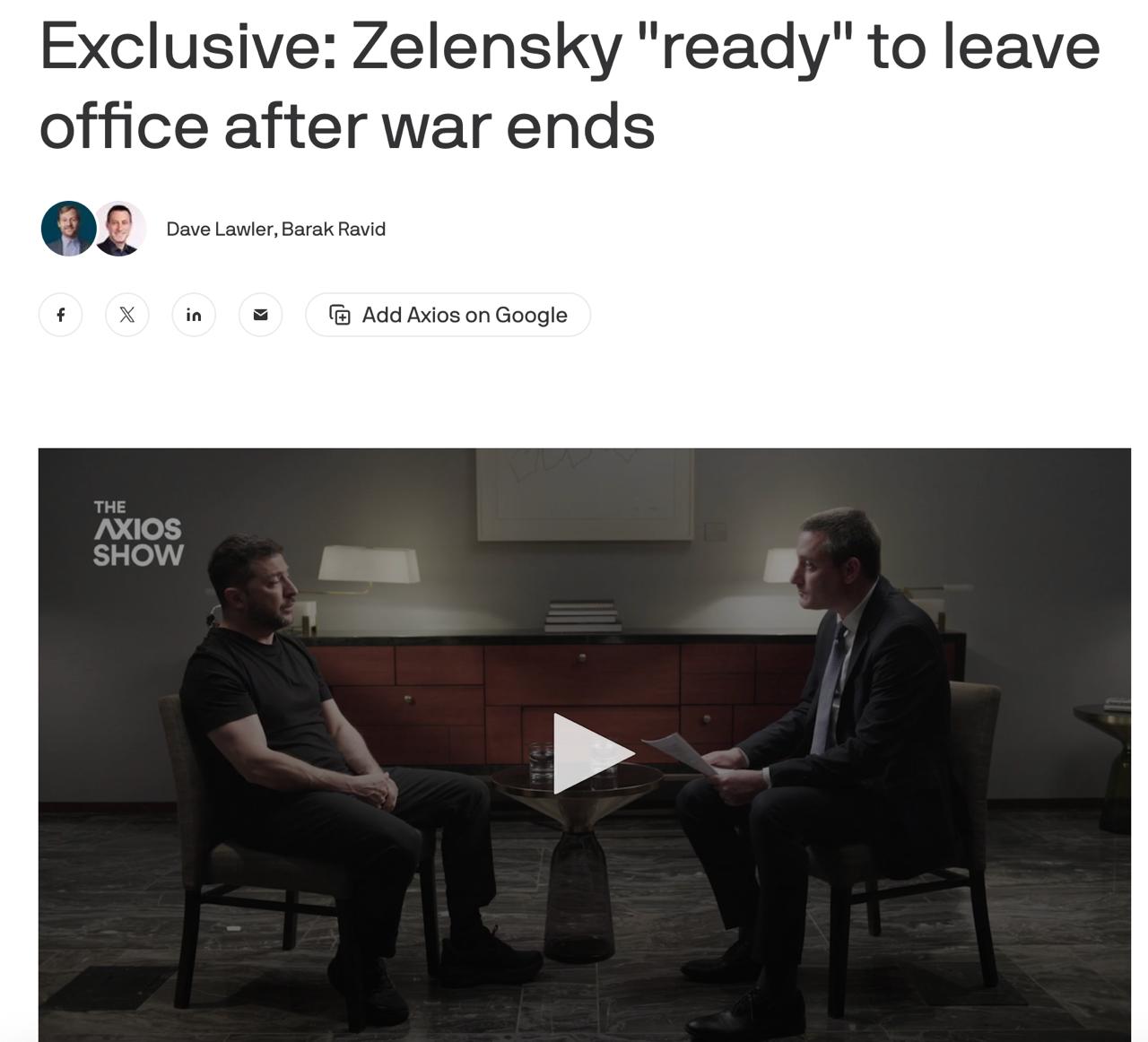 На питання, чи вважатиме він свою роботу закінченою, коли війна зупиниться, Зеленський сказав, що буде готовий піти у відставку. За його словами, його мета – закінчити війну. При цьому він "розуміє", що люди можуть хотіти "лідера з новим мандатом" для ухвалення доленосних рішень, необхідних для досягнення довгострокового світу.