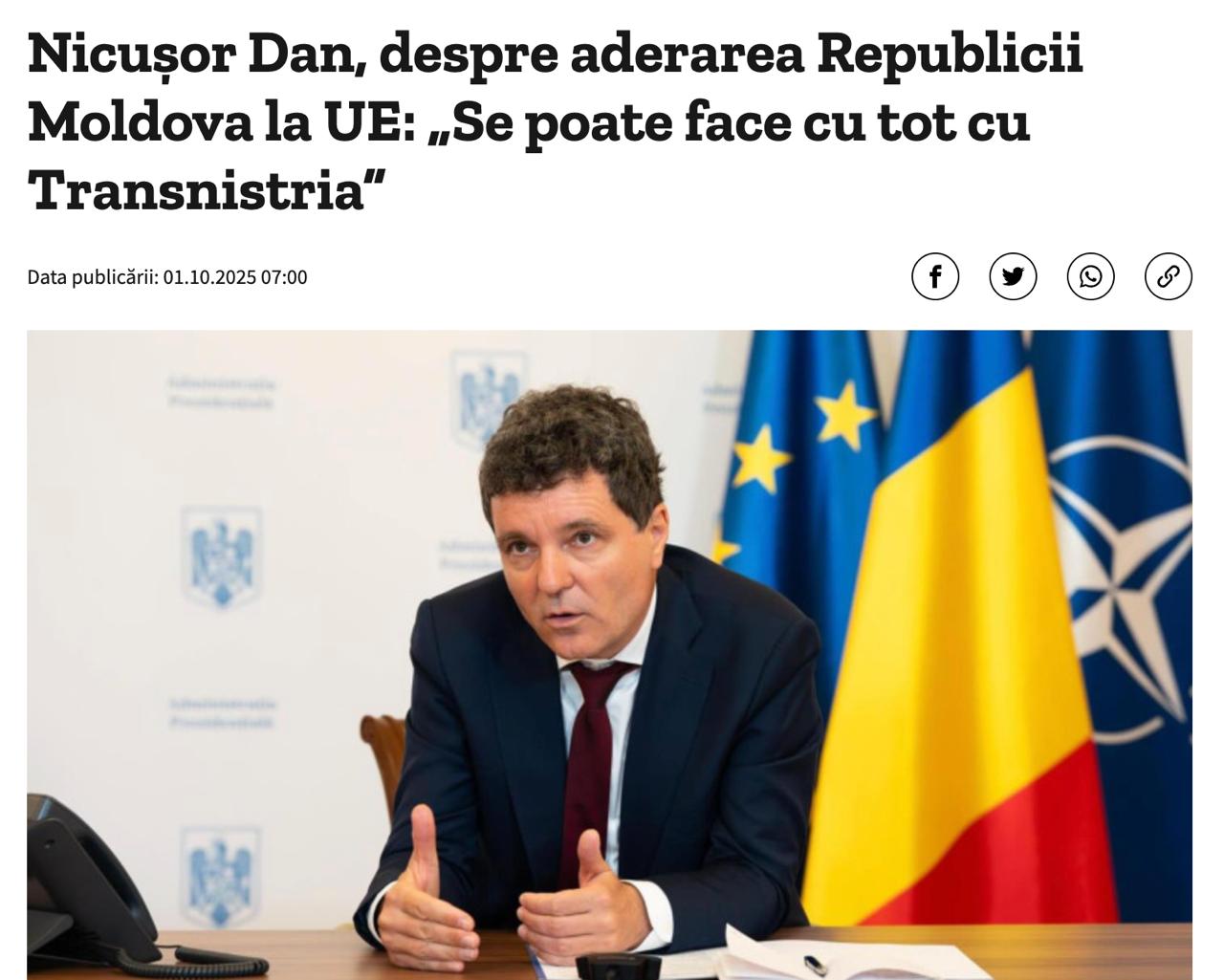 Президент Румунії Нікушор Дан заявив, що Молдова може вступити до Євросоюзу разом із Придністров'ям, якщо надасть йому статус автономії, подібний до Гагаузії.