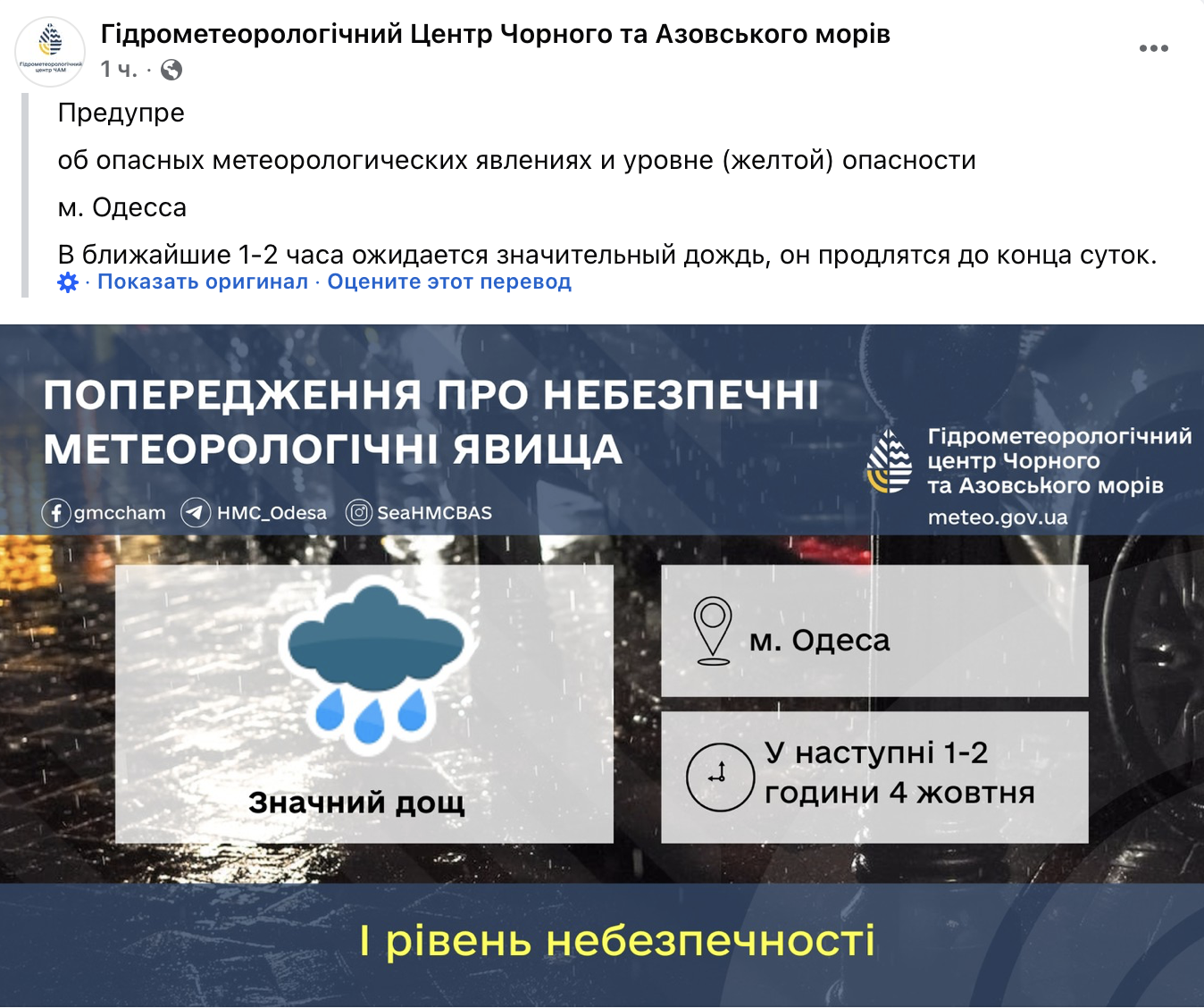 В Одесі очікується підвищена небезпека через дощ. Найближчими 1-2 годинами регіон може спіткати значний дощ, який триватиме до кінця дня.