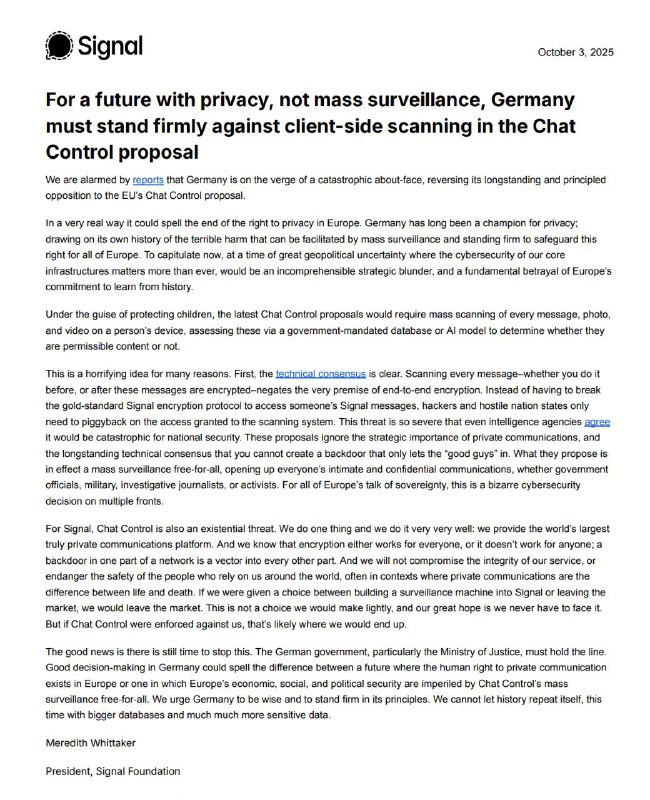 Віттакер закликала німецький уряд, особливо Мін'юст, "виявити мудрість і залишитися вірним своїм принципам", щоб Європа не перетворилася на простір тотального цифрового контролю.