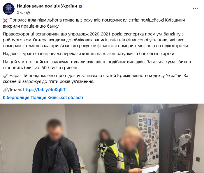 Правоохоронці встановили, що протягом 2020–2021 років співробітниця преміум-банкінгу, використовуючи службовий комп'ютер, входила в акаунти клієнтів фінансової установи, яких вже не було в живих, і змінювала номери телефонів, які вони прив'язали до їхніх рахунків, на контрольовані нею. Після цього вона ініціювала переказ коштів на власні рахунки та банківські картки.