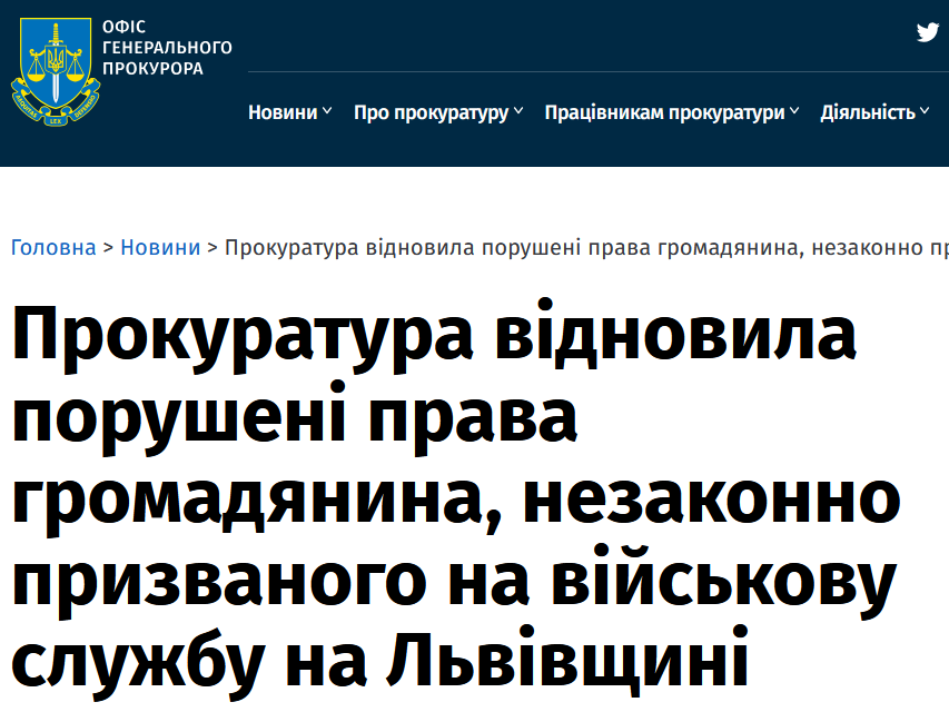"Інформація підтвердилася: чоловік дійсно був покликаний на службу з порушенням вимог закону, оскільки на його утриманні перебував батько – інвалід I групи, а інших родичів, здатних здійснювати догляд, не було. Завдяки злагодженим діям прокурорів, командування військової частини та місцевих органів влади питання про звільнення чоловіка з військової служби за сімейним становищем". прокуратура.