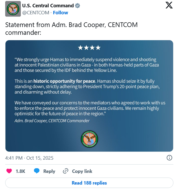 США звинувачують ХАМАС у порушенні мирного плану, закликаючи здати зброю та припинити обстріл палестинців у Газі. Командувач Центрального командування ЗС США (CENTCOM) адмірал Бред Купер закликав ХАМАС "негайно припинити насильство та обстріл безневинних палестинських цивільних осіб у Газі".