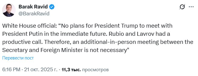 У свою чергу журналіст Axios Барак Давид із посиланням на представника Білого дому повідомив у соцмережі X, що Трамп не планує зустрічатися з Путіним "в найближчому майбутньому".