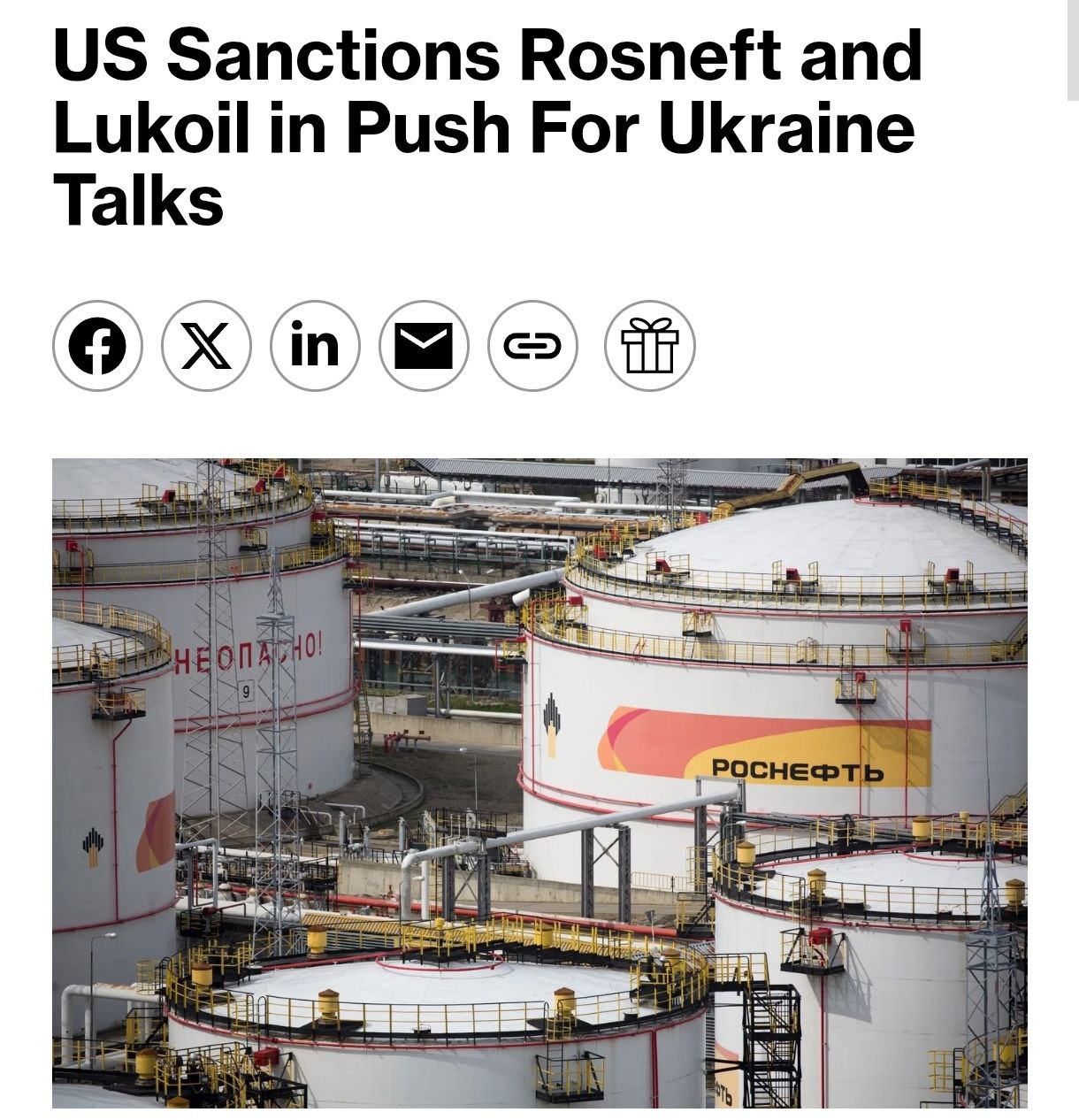 Тим часом, як повідомляє Bloomberg, ціни на нафту різко зросли на тлі повідомлень про санкції США проти "Лукойлу" та "Роснафти".