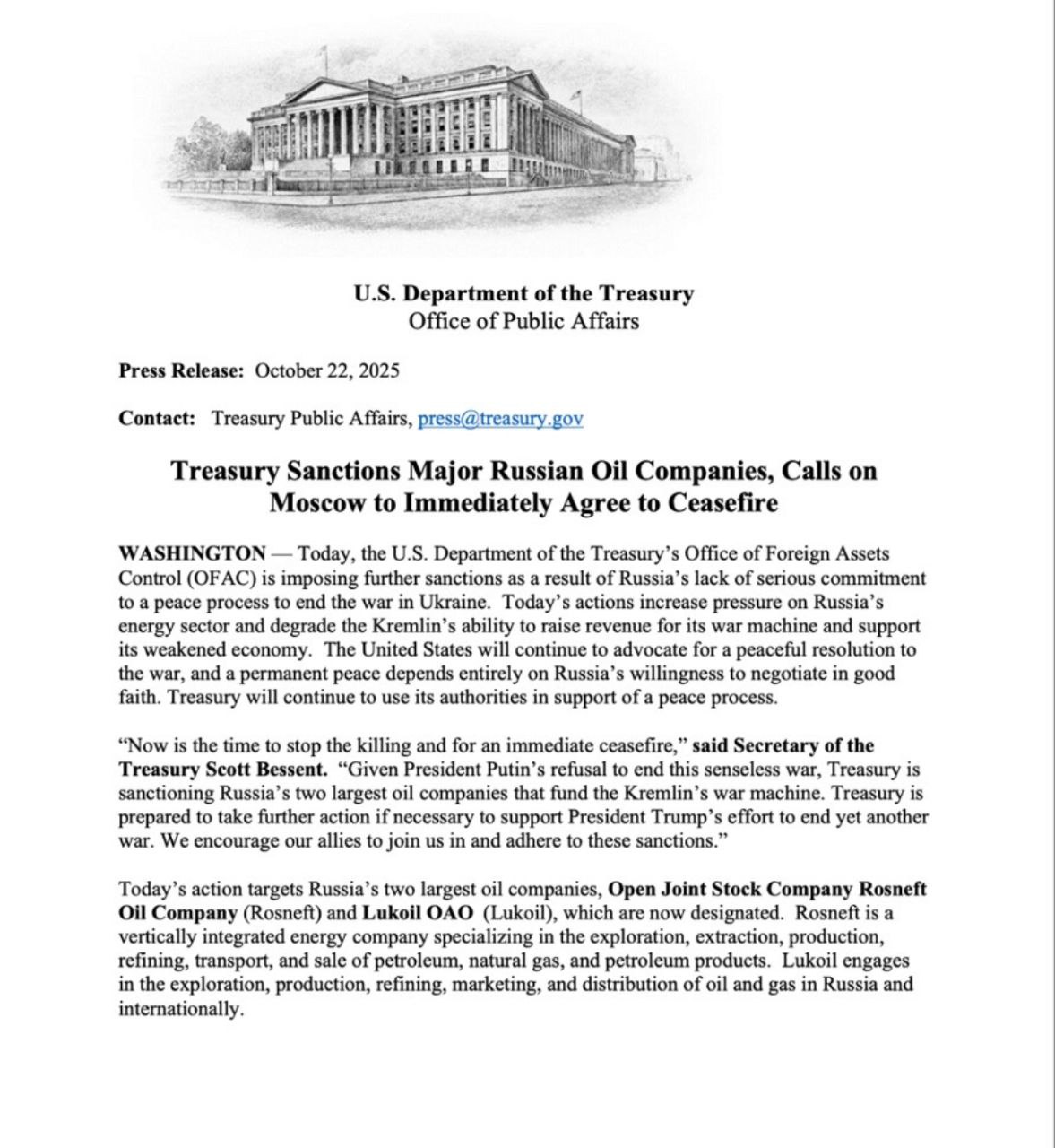 Усі активи та майнові інтереси "Роснефти" та "Лукойлу", що перебувають у США або під контролем американських осіб, блокуються. Будь-які операції за участю цих компаній заборонені для громадян та юридичних осіб США, а також для всіх транзакцій, що проходять через американську фінансову систему (зазначимо, що один із найбільших покупців російської нафти – Індія – платить за паливо в юанях).