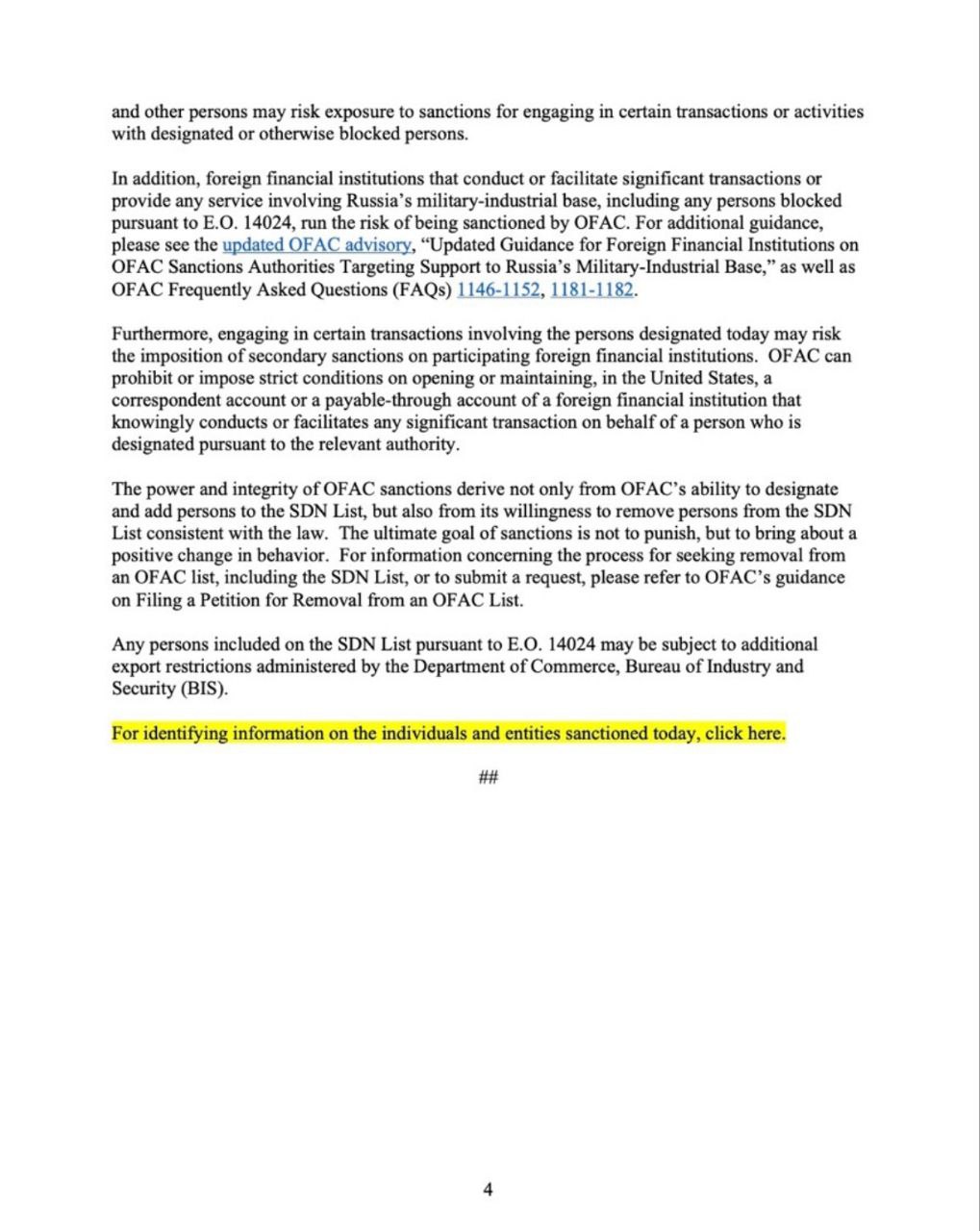 Управління з контролю іноземних активів OFAC окремо попереджає, що іноземні фінансові установи, які проводять або сприяють значним угодам з компаніями, включеними до списків санкцій, наражаються на ризик вторинних санкцій. До таких заходів можуть ставитись заборона на відкриття та ведення кореспондентських рахунків у США, обмеження на доступ до доларових розрахунків та інші форми фінансової ізоляції.
