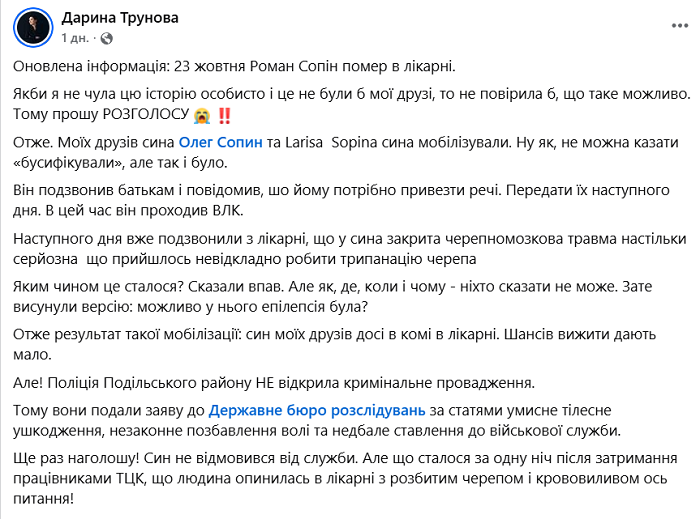У Києві помер примусово мобілізований Роман Сопін, який після ночі в одному із ТЦК та СП опинився у комі.