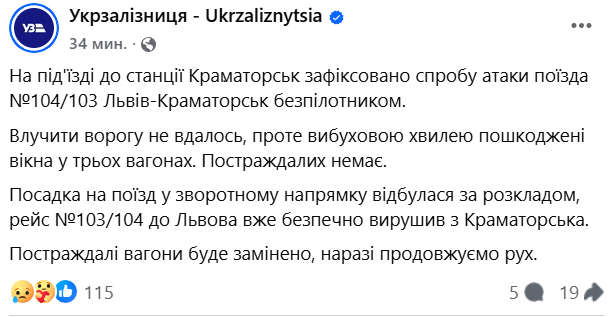 За даними відомства, на під'їзді до станції Краматорськ зафіксовано спробу атаки поїзда Львів–Краматорськ із використанням безпілотника.