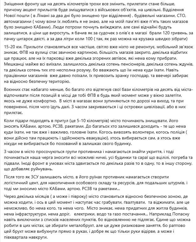 "Жителі майже всі їдуть. З місцевих тут залишаються лише кілька сотень пенсіонерів, кілька сотень ждунів і кілька сотень божевільних, які вважають, що їм нікуди їхати. Військових стає менше, бо вони відсунули свої бази на кілометрів 10. Згодом зникають останні острівці цивілізації на кшталт магазинів", - пише військовий.