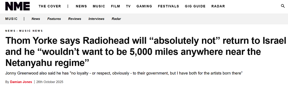 Фронтмен і вокаліст британського рок-гурту Radiohead Том Йорк заявив, що команда більше не даватиме концертів в Ізраїлі.