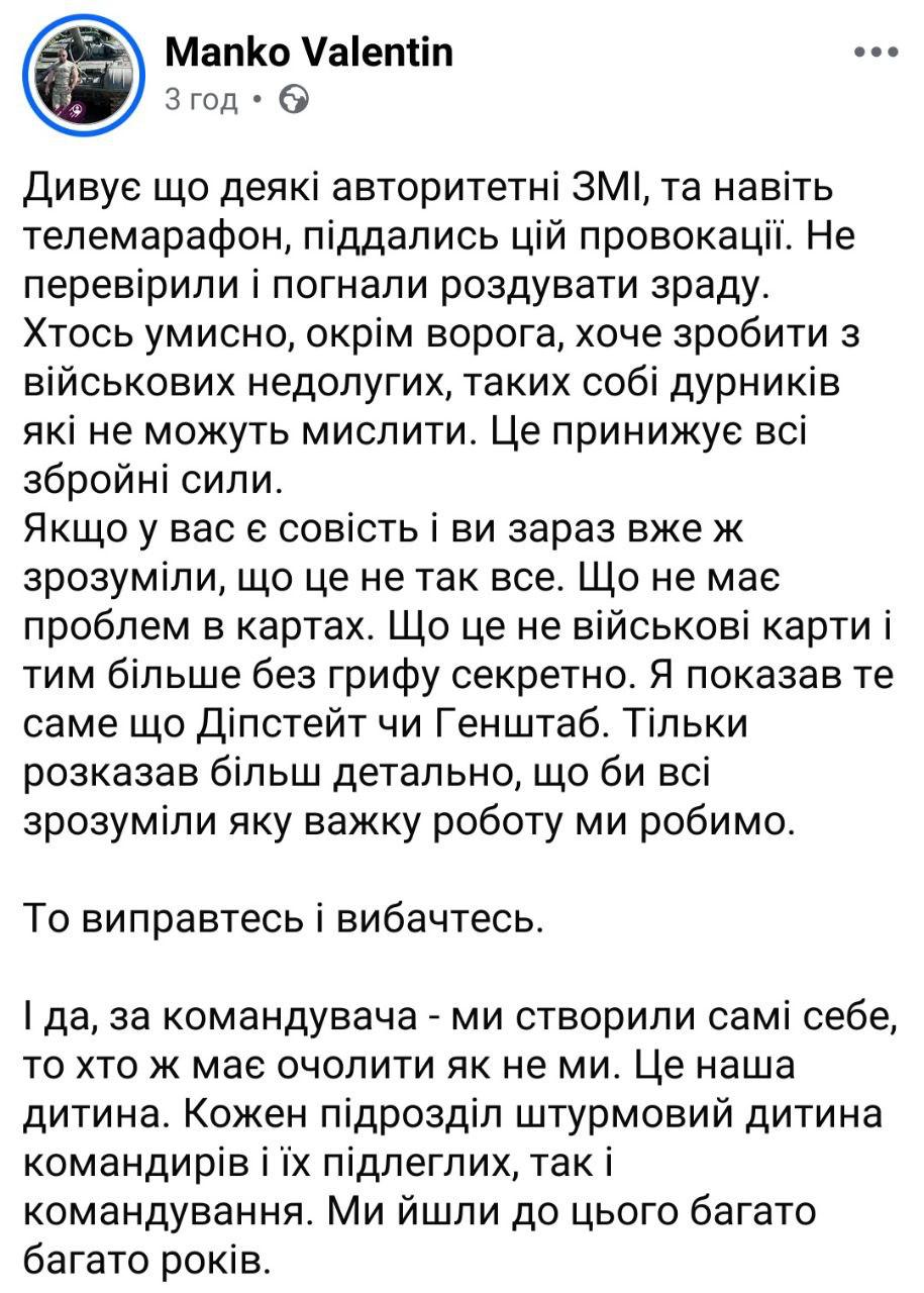 "Дивує, що деякі авторитетні ЗМІ, навіть телемарафон, піддалися цій провокації. Не перевірили і стали роздмухувати "зраду". Хтось навмисне, окрім ворога, хоче виставити військових недалекими, такими собі дурнями, які не вміють мислити. Це принижує всі збройні сили. Якщо у вас є совість, і ви вже зрозуміли, що це не так. Що проблем із картами немає. Що це не військові карти і, тим більше, не секретні. Я показав те саме, що Deep State або Генштаб. Тільки розповів детальніше, щоб усі зрозуміли, яку важку роботу ми виконуємо. То виправтеся і вибачтеся", - заявив військовий.