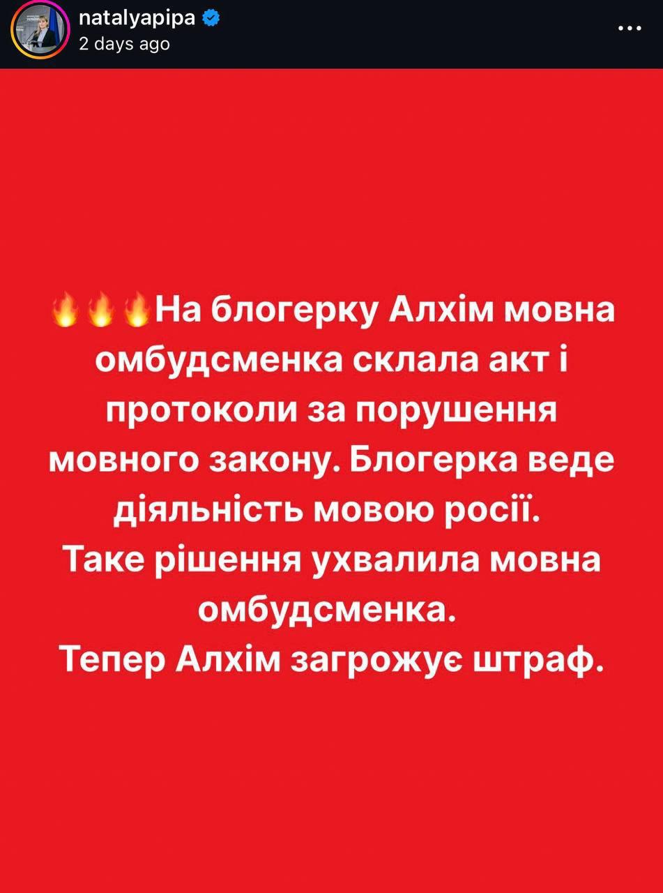 За словами Піпи, за порушення мовного законодавства 34-річній Алхім загрожує штраф.
