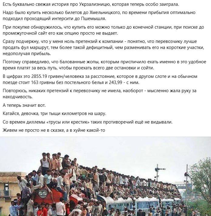 "Безкоштовні 3000 км Укрзалізницею на громадянина за рахунок бюджету, причому не факт, що нашого - це 10 потужностей із 10. З іншого боку, з держборгом всього 8 трильйонів гривень можемо собі дозволити!"