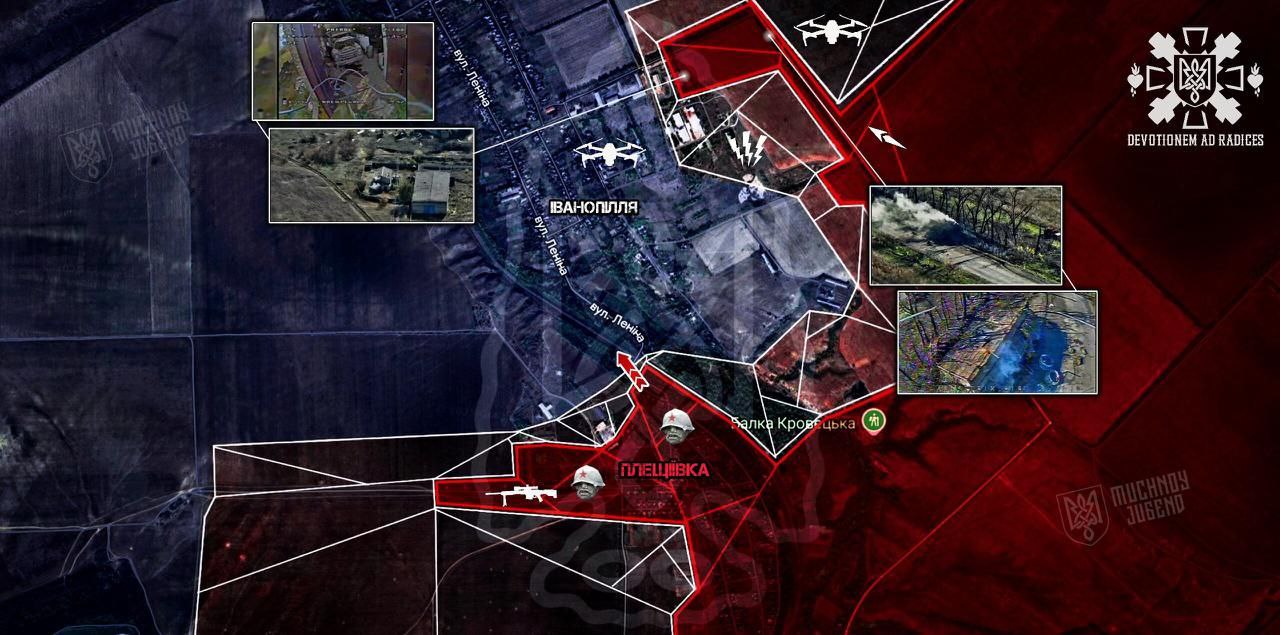 Боєць ЗСУ із позивним Мучною у свою чергу звертає увагу на події на південь від міста. За його інформацією, там уже практично повністю захоплена Плещеївка (за даними Deep State, це село ще знаходиться під контролем України) та розвивається наступ на сусіднє Іванопілля, за яким починається південна околиця Костянтинівки.