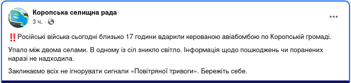 Армія РФ вперше скинула коригувану авіабомбу КАБ на Коропську громаду Чернігівської області, віддалену від кордону на 70 кілометрів.