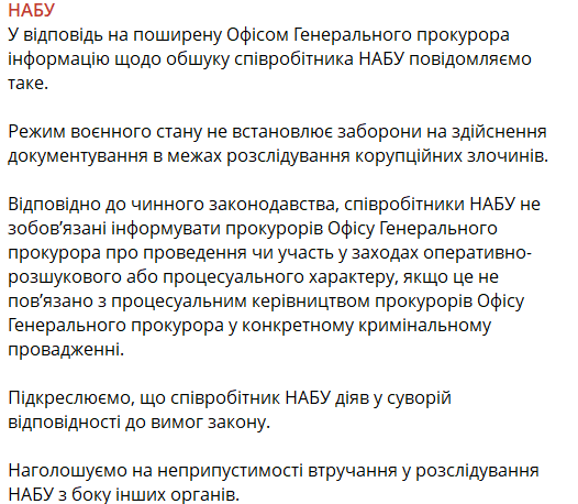 "Наголошуємо, що співробітник НАБУ діяв у суворій відповідності до вимог закону. Зазначаємо неприпустимість втручання у розслідування НАБУ з боку інших органів", – додали у Бюро.