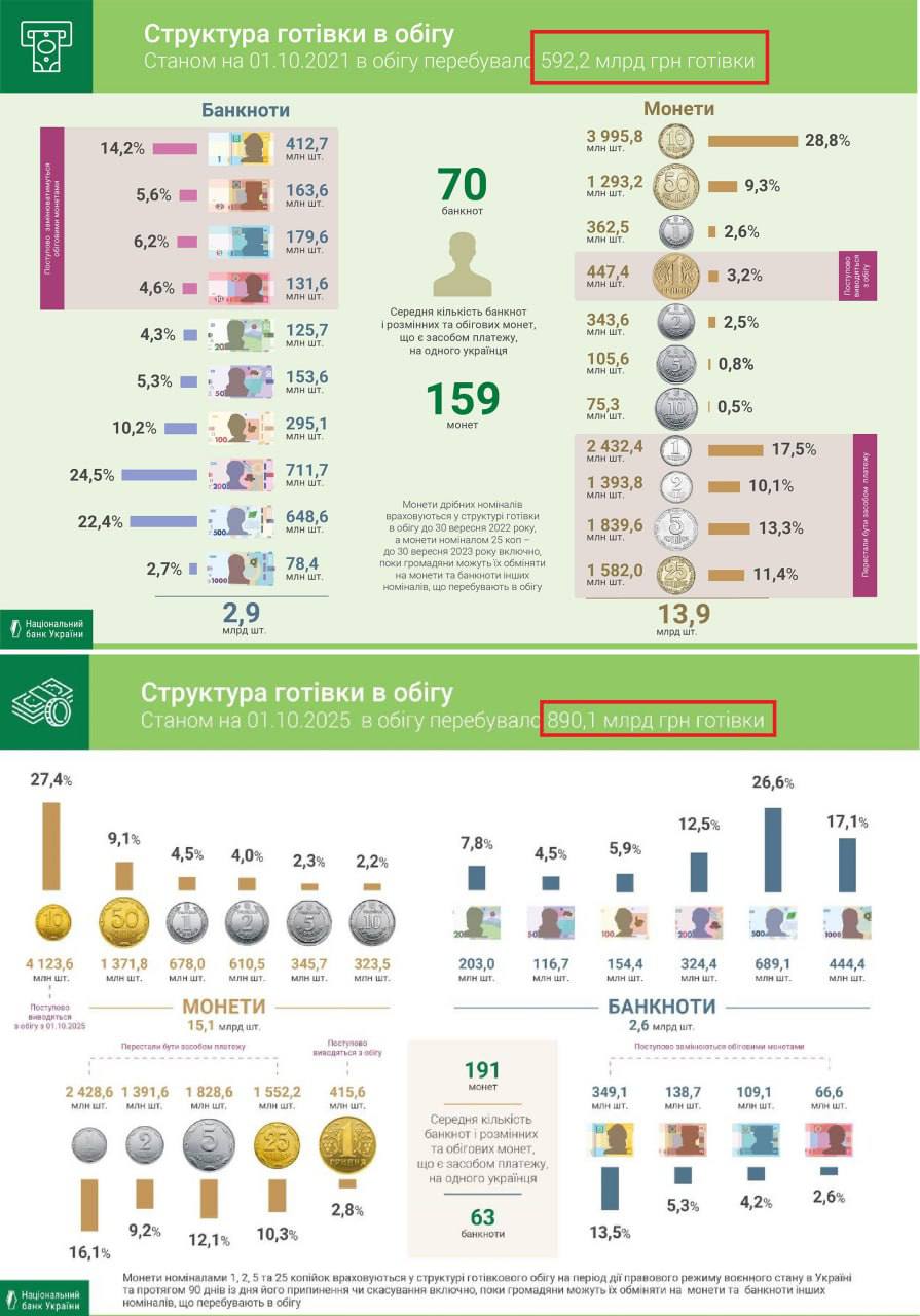 НБУ повідомив, що на 1 жовтня 2025 року на купюри номіналом 500 грн і 1000 грн, припадало, відповідно, 26,6% і 17,1% (43,7% разом) всього банкнотного ряду. У той час як перед війною показники були в 1,7 рази менші: 22,4% на 500 грн та 2,7% на 1000 грн, тобто 25,1% усіх банкнот.