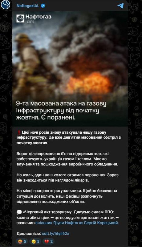 10:59 НАК "Нафтогаз" заявив про дев'ятий з початку жовтня удар по газовій інфраструктурі.
