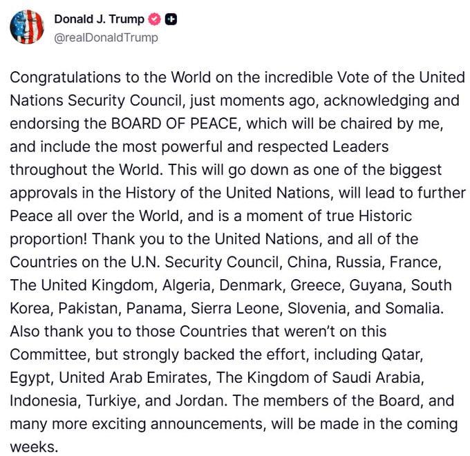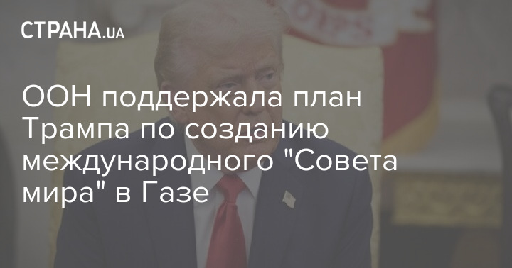 Рада Безпеки ООН підтримала ідею президента США Дональда Трампа зі створенням "Ради світу" для управління сектором Газа. Орган схвалив відповідну резолюцію: 13 із 15 його членів підтримали запропонований США документ. Росія та Китай під час голосування утрималися.