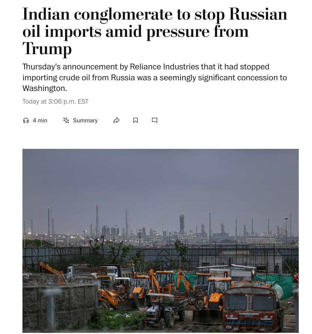 Reliance Industries належить Мукешу Амбані, одному з найбільших бізнесменів Індії та союзнику прем'єр-міністра Нарендри Моді. Конгломерат був найбільшим покупцем російської нафти республіки. З початку конфлікту в Україні в 2022 році компанія придбала сировини на суму близько $33 млрд, це майже 8% усіх експортних продажів російської нафти.