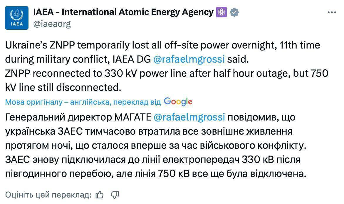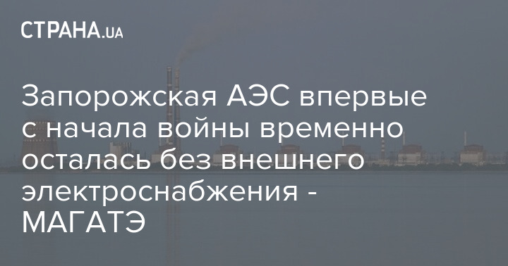 Запорізька АЕС вперше з початку війни тимчасово залишилася без зовнішнього електропостачання - МАГАТЕ