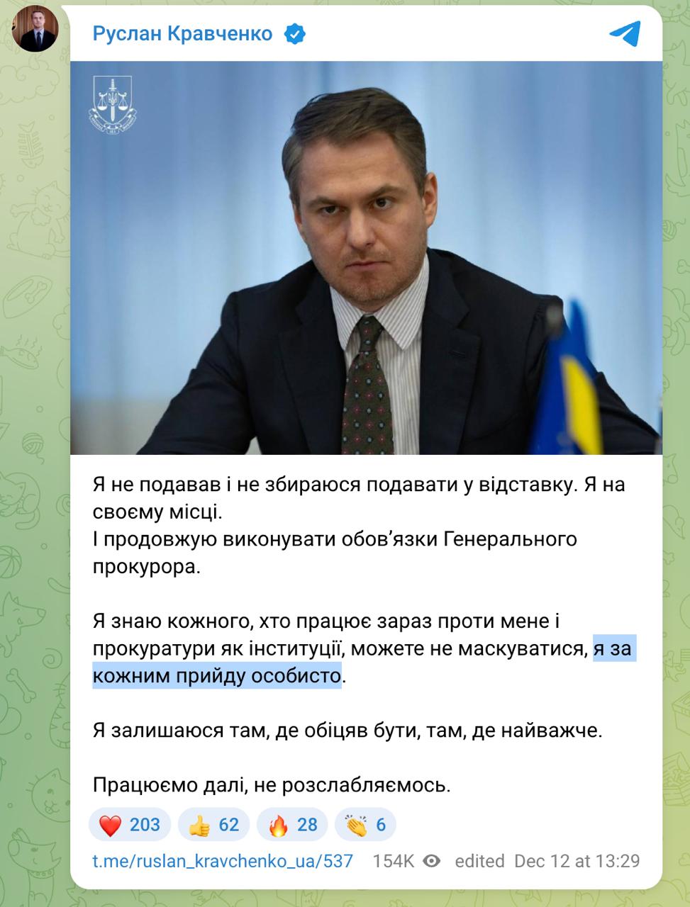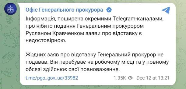 "Інформація, поширена окремими Telegram-каналами про нібито подання генеральним прокурором Русланом Кравченком заяви про відставку, є недостовірною. Жодних заяв про відставку генеральний прокурор не подавав. Він знаходиться на робочому місці і в повному обсязі здійснює свої повноваження", - йдеться у повідомленні.