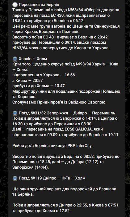 Ключовим маршрутом для поїздок зі сходу України до країн ЄС став поїзд №63/64 "Оберіг" Харків – Київ – Перемишль. У Перемишлі пасажири можуть пересісти на європейські поїзди до Німеччини, Австрії та Чехії.