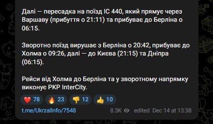 Для мешканців Наддніпрянщини передбачено поїзд №31/32 Запоріжжя - Дніпро - Перемишль з пересадкою на поїзд EC 58 GALICJA в Берлін. Потяг №119 Дніпро - Київ - Хелм відкриває додаткові можливості для подорожей до Варшави та Берліна з наступними пересадками на європейські маршрути.