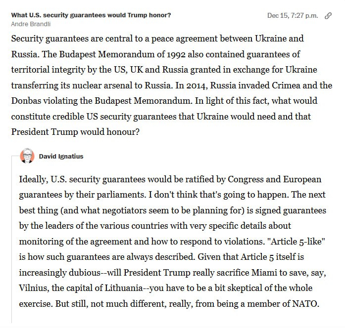 "В ідеалі гарантії безпеки США повинні ратифікуватися конгресом, а європейські гарантії – їх парламентами. Я не думаю, що це станеться. Найкращий варіант (і, схоже, саме до цього прагнуть переговорники) – це підписані лідерами різних країн гарантії з дуже конкретними деталями щодо моніторингу виконання угоди і порядку. статті 5". Враховуючи, що сама стаття 5 стає все більш сумнівною - невже президент США Дональд Трамп дійсно пожертвує Майамі, щоб врятувати, скажімо, Вільнюс, столицю Литви, - до всієї цієї витівки слід ставитися з деяким скептицизмом. Але все ж таки, по суті, це не сильно.