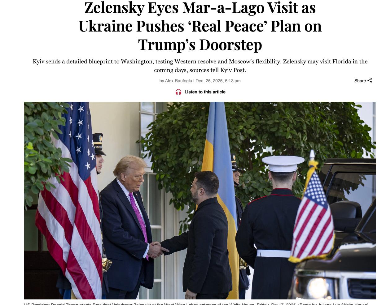 "Очікується поїздка до Флориди найближчими днями для напружених переговорів до Мар-а-Лаго - потенційного місця для зустрічі з керівництвом США. Візит може відбутися вже 28 грудня, якщо все піде за планом", - пише видання.