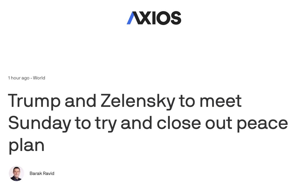 Інсайд Axios підтвердив Зеленський, заявивши, що його зустріч із Трампом потрібна для узгодження спірних 10% у проекті мирного плану, зокрема, питань гарантій безпеки, територій та повоєнного відновлення України. За словами президента, решту 90% уже погоджено на рівні делегацій.