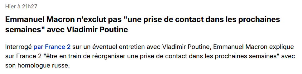 "Все має бути організовано у короткостроковій перспективі. Необхідно продовжувати підтримувати Україну в її зусиллях з оборони. Це те, що ми робимо. Ми зараз організовуємо контакт, який має відбутися найближчими тижнями", – заявив президент Франції.
