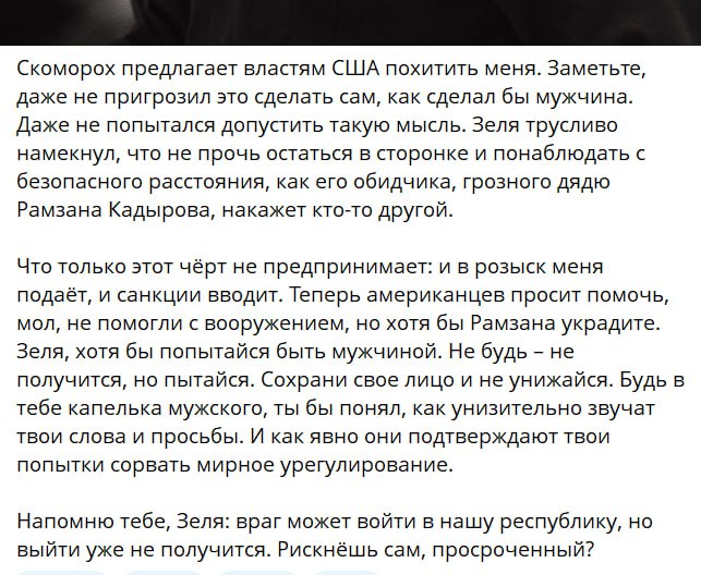 "Тепер американців просить допомогти, мовляв, не допомогли з озброєнням, але хоча б Рамзана вкрадете… Збережи своє обличчя і не принижуйся. Якби в тебе була крапелька чоловічого, ти зрозумів би, як принизливо звучать твої слова та прохання", – звернувся Кадиров до українського президента.